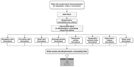 The novelty of this article is given by the implementation of a model that was developed in the model builder interface and that can be integrated and optimized into an ArcGIS tool, calculating the morphometric flood vulnerability score for drainage basins of a specific Horton–Strahler hierarchic order, resulting in the creation of a file that indicates, based on morphometric factors extracted from DEM, the susceptibility of basins to flooding. Secondly, this tool is completely automated, requiring no intervention from the user, except for inputting an elevation model, and choosing the threshold value and which river order should the model run for. Thirdly, the tool does not take into account only one parameter but eight morphometric parameters, which it calculates on its own, from a single layer. Furthermore, several types of potential errors that may occur while running the model have been accounted for, and solutions for their mitigations have been implemented directly into the model. In addition, the final result is a unitary vector file, with a detailed, comprehensive attribute table, which is easily interpretable. These types of files can be the basis for other flood simulation models, but they can also be a useful basis for local authorities when planning the expansion of the built-up area of settlements, as well as when allowing the construction of new homes. The model can be applied both at large and small scales, it being suitable for all types of areas, depending on different resolutions of digital terrain models. Lastly, the model has been run and has provided results for the entire country at all available drainage basin hierarchical orders, according to the Horton–Strahler classification system. The vast majority of previous studies on this topic have only addressed specific case studies, in the form of smaller drainage basins, and not a centralized geospatial situation of the entirety of Romania. This model has been applied to basins throughout Romania, and the result is a novelty for the country; it is the only applied model that results in the identification of flood-prone areas based on morphometric considerations for the entire country.