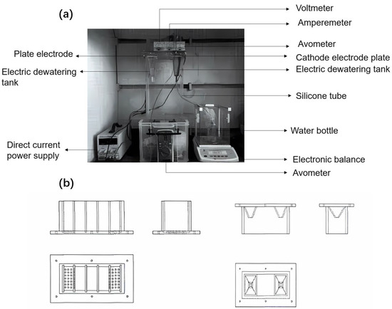 (a) Physical picture of electrokinetic dewatering and heavy metal remediation. (b) Three views of the upper part (left) and lower part (right) of the electro-dewatering tank.