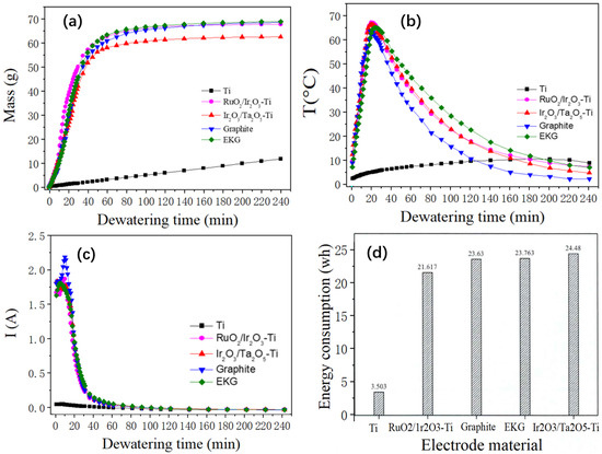 (a) Change in water mass with time during the dewatering of the different electrode materials; (b) Variation of sediment temperature with time during the electro-dewatering of the different electrode materials; (c) Current over time for the different electrode materials; (d) Energy consumption per unit mass of water removed for electro-dewatering of the different electrode materials.