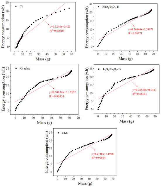 In the present study, we conducted a fitting of the energy consumption and water removal quantity during the dehydration process for the different electrode materials. This resulted in obtaining both actual change curves and fitting curves for dehydration energy consumption and dehydration quality for each electrode material.