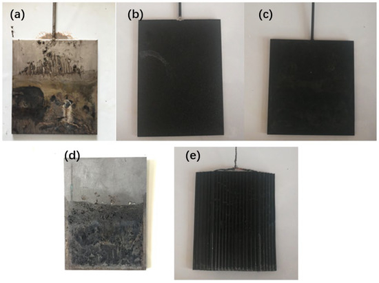 Corrosion of the different electrode materials: (a) Ti electrode, (b) RuO2/Ir2O3-Ti electrode, (c) Ir2O3/Ta2O5-Ti electrode, (d) Graphite electrode, (e) EKG electrode.