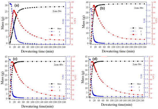 Curves of water quality, current, and temperature over time under different voltages; (a) Change of water mass, current and temperature with time during dewatering at 20 V, (b) Change of water mass, current and temperature with time during dewatering at 30 V, (c) Change of water mass, current and temperature with time during dewatering at 40 V, (d) Change of water mass, current and temperature with time during dewatering at 50 V.
