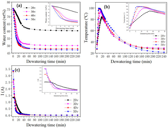 We can see from Figure 6a that with an increase in voltage, the initial rate of the electrodynamic dehydration stage also rose. When the voltages were 20 V, 30 V, 40 V, and 50 V, the times required to reach the basic non-dehydration stage were 100 min, 80 min, 55 min, and 100 min, respectively. The final moisture contents of the four groups of experimental samples were 60.3%, 50.16%, 48.05%, and 47.12%. It can be seen that as the voltage increased, the final moisture content of the sediment decreased, indicating that larger electric field strength contributed to the final electrodynamic dehydration and curing effect. As the voltage increased from 20 V to 30 V, the rate of dewatering increased by 10.14%. However, when the voltage increased from 30 V to 40 V and from 40 V to 50 V, the rate of dehydration increased by 2.11% and 0.93%, respectively. According to the experimental results depicted in Figure 6a, during the dewatering process, if the voltage continued to increase at the higher voltages, the improvement in dehydration rate gradually decreased, perhaps because the sludge layer near the anode dried and cracked under the large electric field strength. One possible explanation for this result is that a high voltage could lead to excessive current, which might cause a large amount of gas near the anode drying electrode to increase the resistance. Another possibility is that the cracking of the sludge near the anode led to a reduction in the contact area between the sludge cake and the electrode plate.