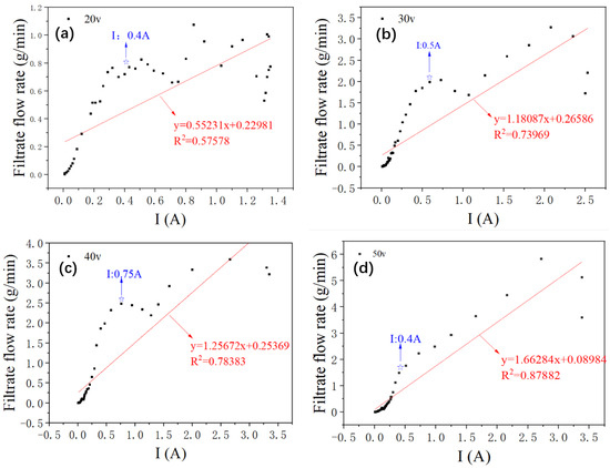Fitting curve of filtrate flow rate and loop current during dewatering at different voltages; (a) Fitting curve of filtrate flow rate and loop current during dewatering at 20 V, (b) Fitting curve of filtrate flow rate and loop current during dewatering at 30 V, (c) Fitting curve of filtrate flow rate and loop current during dewatering at 40 V, (d) Fitting curve of filtrate flow rate and loop current during dewatering at 50 V.