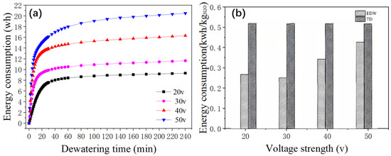 Figure 8a illustrates the total energy consumption and the specific energy consumption for the removal of a unit mass of water during 240 min of dewatering at different voltages. At a voltage of 20 V, the total energy consumed is 9.32 Wh; at 30 V, it is 11.64 Wh; at 40 V, it rises to 16.31 Wh; and at 50 V, it reaches 20.49 Wh. It is apparent that the total energy consumption for dewatering is greatly influenced by the applied voltage, indicating that the electric field strength is a critical factor affecting the energy consumption of electro-dewatering processes.