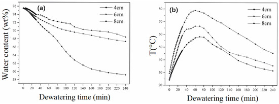 Figure 9b illustrates a consistent temperature trend for sludge at different electrode spacings, where the temperature initially increases before decreasing, with peak temperatures for all test groups reached within 60–80 min. Under an electric field strength of 5 V/cm, the peak temperatures corresponding to electrode spacings of 4 cm, 6 cm, and 8 cm were 58.1 °C, 66.5 °C, and 78.8 °C, respectively. In general, during the dewatering process at a constant electric field strength, a larger electrode spacing results in a higher sludge temperature, indicating increased heat generation and consequently higher thermal energy consumption.