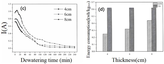 Figure 9d presents a bar chart depicting the specific energy consumption for the removal of a unit mass of water and the thermal drying energy consumption at the end of the dewatering process for different electrode spacings. At an electrode spacing of 4 cm, the energy consumption after 240 min of dewatering is 0.25 kWh/kgH2O. This value increases to 0.32 kWh/kgH2O for a spacing of 6 cm and further to 0.44 kWh/kgH2O for an 8 cm spacing. It is evident that the specific energy consumption for sludge dewatering escalates with increasing electrode spacing, with the effect becoming more pronounced at larger spacings. For instance, an increase in electrode spacing from 4 cm to 6 cm results in a 28% rise in energy consumption, while a further increase from 6 cm to 8 cm leads to a 37.5% increment, equivalent to a 0.34-fold increase. Nevertheless, these values remain below the minimum energy consumption for thermal drying, with the three experimental setups exhibiting 28.7–59.5% lower energy consumption compared to thermal drying.