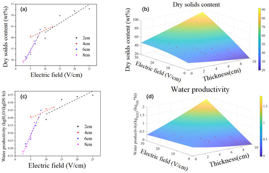 Figure 10b shows the response model of the final solid content affected by the electric field intensity and plate spacing, and its functional relationship is shown in Equation (6):