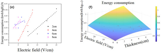 Figure 10f shows the response model of water loss rate affected by electric field intensity and plate spacing, and its function relationship is shown in Equation (8):