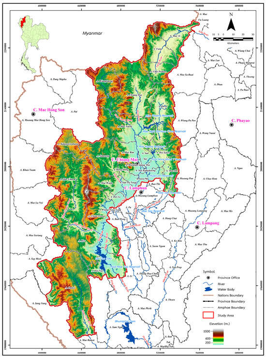 - Land Development Department (LDD). Land Use Map (Level 1) in Chiang Mai Province (GIS), Scale of 1:25,000; Land Development Department: Bangkok, Thailand, 2020. [Google Scholar]