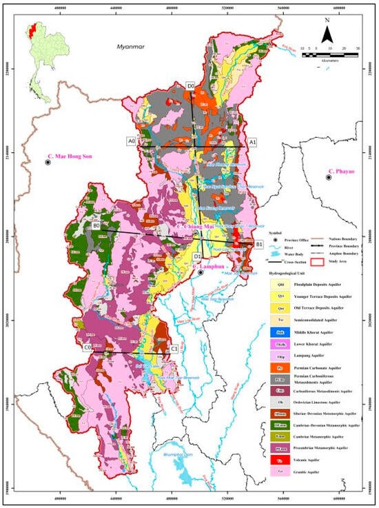 The hydrogeological characteristics and the geological map of Chiang Mai Province are shown in Figure 2. The province exhibits both unconsolidated and consolidated aquifers. The unconsolidated aquifers in Chiang Mai Province cover an area of approximately 2800 sq.km. or 1,750,000 rais, ranging from 18°30′ to 19° N and from 98°45′ to 99°15′ E. These areas are flanked by mountain ranges on both the east and west sides, with the Ping River being the main river, generally flowing from north to south. The narrowest width of Chiang Mai Province is approximately 20 km. []. Various geologic units, spanning from Precambrian to recent ages, are exposed in the area. Unconsolidated Quaternary alluvium deposits overlay older rock formations, dominating most of Chiang Mai Province [,,]. These aquifers comprise Quaternary sediments, including gravel, sand, silt, and clay, categorized as fluvial deposits aquifers (Qfd), younger terrace aquifers (Qyt), consisting of low terrace aquifers (Qtl) and middle terrace aquifers (Qtm); and the old terrace aquifer (Qot), comparable to high terrace aquifers (Qth) and colluvial aquifers (Qcl). The fluvial deposits aquifer is widespread in the lowlands of the Chiang Mai-Lamphun basin.