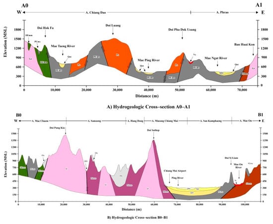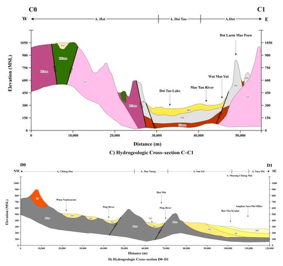 On the other hand, consolidated aquifers encompass semi-consolidated aquifers (Tsc), middle Korat aquifers (Jmk), lower Korat aquifers (TRJlk), Lampang aquifers (TRlp), Permian carbonate rocks aquifers (Pc), Permian-Carboniferous metasediments aquifers (PCms), Carboniferous metasediments aquifers (Cms), Ordovician limestone aquifers (Ols), Silurian-Devonian metamorphic aquifers (SDmm), Cambrian metamorphic aquifers (Emm), Precambrian metamorphic aquifers (PEmm), Volcanic aquifers (Vc), and Granitic aquifers (Gr). All these aquifers may undergo fracturing during tectonic events, transforming into cracked consolidated rock aquifers. Groundwater wells in Chiang Mai Province are typically shallow, with a general depth ranging from approximately 20 to 70 m below the ground surface. Figure 3 shows that hydrogeologic cross-sections in lines A0–A1, B0–B1, C0–C1, and D0–D1 (refer to Figure 2) are derived from various lithologic logs, illustrating that semi-consolidated-to-consolidated aquifers are amalgamated into a single, heterogeneous unit, denoted by a dark red color.