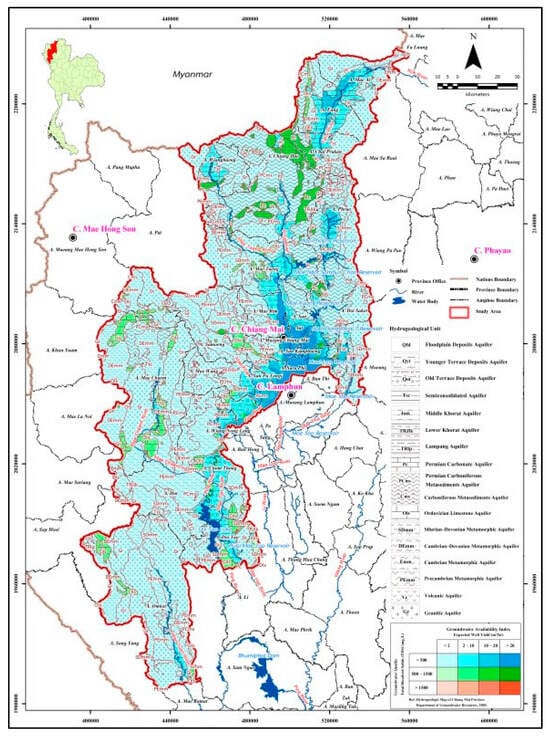 - Department of Groundwater Resources (DGR). Groundwater Potential Map of Chiang Mai Province, Scale 1:100,000; Ministry of Natural Resources and Environment: Bangkok, Thailand, 2017. [Google Scholar]