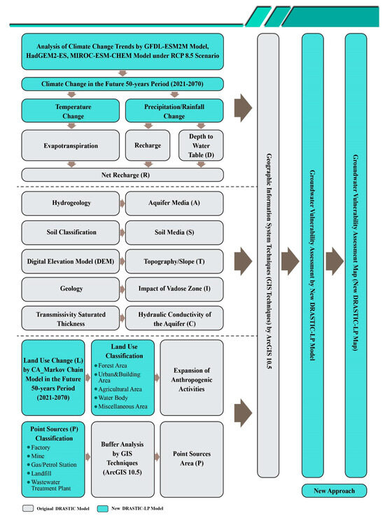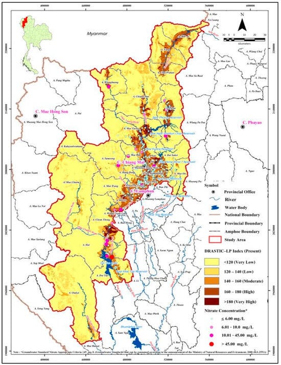In Chiang Mai Province in the northern region of Thailand, land-use patterns and point source pollution stand out as primary contributors, directly impacting groundwater resources. Consequently, the vulnerability assessment of groundwater resources, utilizing the new DRASTIC-LP model (modified from Aller et al. []), aims to simulate both the current situation and future scenarios, considering climate change under high emission scenarios (or RCP8.5 scenario) and land-use pattern changes. Additionally, the identify-cation of contamination-risk areas is an integral part of this assessment. To identify the impacts of the mentioned factors on groundwater vulnerability, the study proposes an integrated approach, as follows: