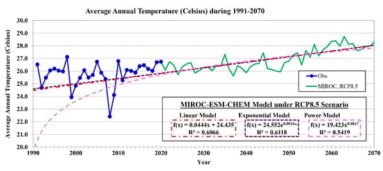 A performance analysis of the three general climate models (3GCMs), namely the GFDLSM2M model, the HadGEM2-ES model, and the MIROC-ESM-CHEM model, were compared to determine which model was most suitable for predicting both temperature and rainfall, according to the coefficient of determination (R2 or R-square). From the study, it was revealed that the MIROC-ESM-CHEM model can simulate rainfall behavior in the 30-year period (1991–2020), corresponding to past rainfall behaviors, according to the coefficient of determination (max R2 = 0.5991); this does so in a much more effective way than the HadGEM2-ES model (max R2 = 0.5613), and GFDLSM2M model (max R2 = 0.4503).
