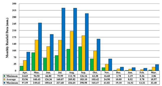 2. Monthly rainfall data from the same period from the Thai Meteorological Depart-ment (TMD) [], which included 39 stations, and the Royal Irrigation Department (RID) [], which included 10 stations, but here, the extreme rainfall values were gathered. The continuous monthly rainfall data over a five-year period were used to analyze an average, minimum, and maximum monthly rainfall, as shown in Figure 8.