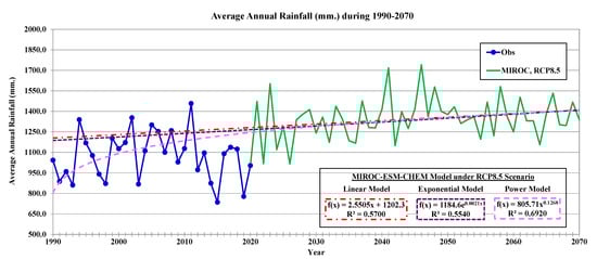 Analysis of future rainfall situations by MIROC-ESM-CHEM model under RCP8.5 scenario (very high greenhouse gas (GHG) emissions) as shown in Table 3 and Figure 9. During the 30–year period (1991–2020), the average annual rainfall is 1071.43 mm/year. From the prediction of the model, in the decade of 2021–2030, the average annual rainfall is predicted to be 1241.36 mm/year, with a trend increasing of +15.86% over the 30–year period (1991–2020). During the rainy season (July to October) in this decade (2021–2030), the model predicts to be 209.13–290.25 mm., and the highest monthly rainfall in September is 290.25 mm/year. Moreover, in the decade of 2031–2040, the average annual rainfall is predicted to 1241.36 mm/year, with an increasing trend of +15.86% over than the 30–year period (1991–2020). The overall average annual rainfall for three periods: 2041–2050, 2051–2060, and 2061–2070, the model predicts to be 1377.25, 1250.12, and 1339.16 mm/year, respectively. Their average annual rainfall of them, predicted to increase of +16.68% to +28.54%, over the 30–year period (1991–2020).
