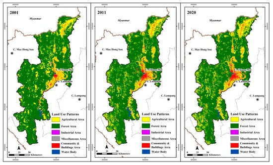 Land-use patterns of Chiang Mai Province level 1 (2001, 2011, and 2020).