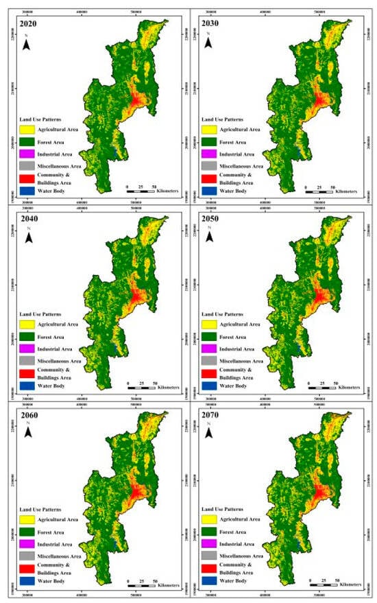 Land-use patterns of baseline (2020) and future 50-year periods (2021–2070), using the CA_Markov Chain model and GIS-based techniques.