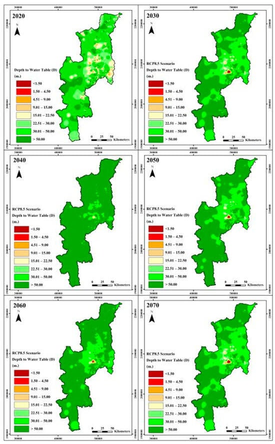 - Huang et al. [] confirmed the depth-to-water table (DTW), and also confirmed that the land-use patterns contribute differently to variations in groundwater resource vulnerability. Additionally, this study emphasizes generating an impact model of climate changes and anthropogenic activities on future groundwater resource vulnerability, directly linking future DTW variations to climate change and associating land-use patterns with anthropogenic activities.