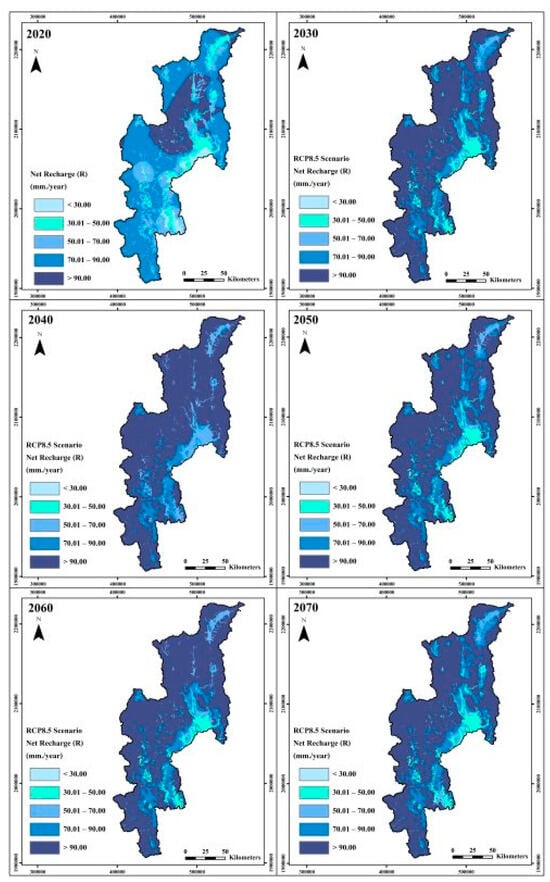The results of the new DRASTIC-LP mapping indicate that groundwater resource vulnerability patterns in Chiang Mai Province will change over the next 50 years (2021–2070). The risk of groundwater resource vulnerability, centered around districts like Mueang Chiang Mai District, Mae Rim District, Saraphi District, Mae Taeng District, Hang Dong District, San Sai District, San Pa Tong District, San Kamphaeng District, Chom Thong District, Doi Tao District, Doi Lo District, Mae Ai District, Fang District, and Hot District, is expected to spread continuously to surrounding areas. The study emphasizes that the eastern areas of Chiang Mai Province, particularly recharge areas and low-lands along main rivers and tributaries, will be significantly affected by climate change and land-use pattern changes. Under the RCP8.5 scenario (very high greenhouse gas emissions) in the next 50 years (2021–2070), the new DRASTIC-LP modeling reveals an increased contamination risk in groundwater resources through nitrate (NO3−) compounds from chemical fertilizers and/or pesticide in intensive agricultural sectors and/or the processing of industrial areas, especially in the eastern part of Chiang Mai Province. The results indicate a notable rise in groundwater pollution risks under these scenarios, suggesting that the rapid development of Chiang Mai Province may not be sustainable in terms of the environment, social aspects, and quality of life. Recent field studies conducted during February to March 2020, May to June 2020, and November to December 2020 [,] further support these findings, showing a significant increase in nitrate (NO3−) concentrations in the shallow groundwater aquifer in eastern areas and lowlands along main rivers and tributaries. Furthermore, in the future, increasing risks of groundwater pollution will persist, driven by urbanization and the expansion of intensive agricultural areas, industrial processes, and anthropogenic activities. To address these concerns, effective site selection, the prioritization of monitoring areas, appropriate remedial measures, and the formulation of pollution protection and prevention strategies and policies are crucial, especially in high groundwater vulnerability areas.