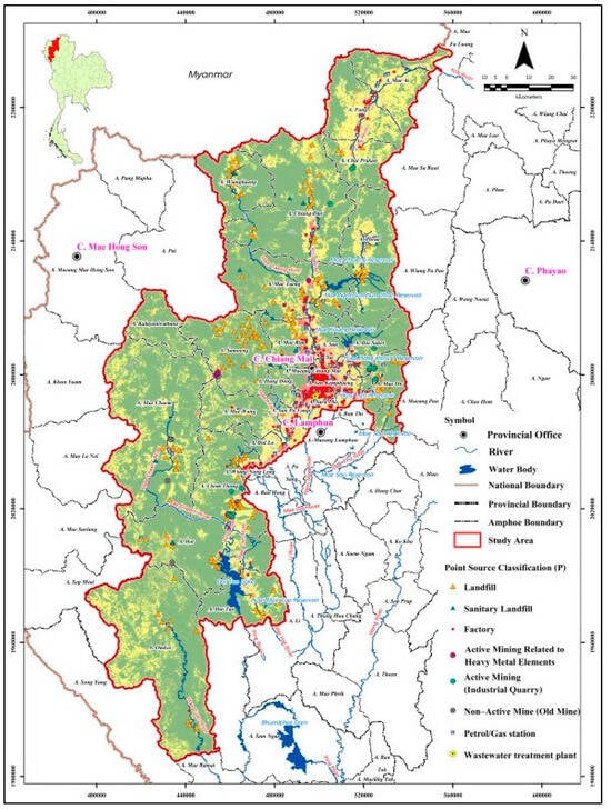 Chiang Mai Province covers a total area of 20,107.06 sq.km. or 12,566,912.50 rais, as shown in Figure 1 []. Situated in the upper northern part of Thailand, it stands out as one of the fastest-growing cities, experiencing rapid development in both economic and social sectors. This growth has resulted in the expansion of urban communities, industrial sectors, and the tourism industry. The escalating economic prosperity, coupled with the infusion of modern technology to enhance productivity and meet public sector demands, has led to the overuse of available resources, particularly water. Consequently, a surge in water demand has emerged as a significant challenge. Despite comprising predominantly reserved and conserved areas, covering 15,403.77 sq.km. or 9.627 million rais, constituting 76.61 percent of Chiang Mai’s total area [], legal restrictions prevent the development of medium-to-large surface water reservoirs. The province is situated within the Chiang Mai-Lamphun and Fang groundwater basins [], with a potential groundwater source. capable of supplying water ranging from less than 2 cubic meters/hour to more than 20 cubic meters/hour []. Utilizing groundwater in both basins to replace or supplement surface water sources stands as a beneficial solution across all sectors. The expansive growth in economic and social systems within Chiang Mai Province has significantly influenced the diversity of land-use patterns and the expansion of residential, commercial, industrial, and agricultural sectors. It is evident that activities in these sectors contribute to environmental pollution, posing a threat to groundwater contamination in the Chiang Mai-Lamphun and Fang groundwater basins [,].