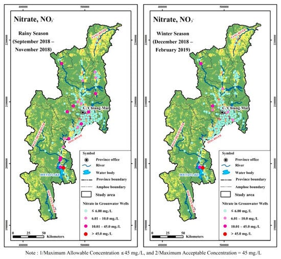 The issue of groundwater pollution has garnered significant attention in Thailand, particularly in the northern region, which holds an estimated 166,860 million cubic meters of groundwater resources, constituting 14.67% of the nation’s total groundwater volume []. However, due to rapid population growth and extensive development in the tourist, industrial, and agricultural sectors of northern Thailand, the groundwater situation has suffered varying degrees of damage [,]. Aligning with prior studies, it has been reported that 80% of shallow groundwater and 30% of deep groundwater in the People’s Republic of China exhibit varying levels of pollution [].