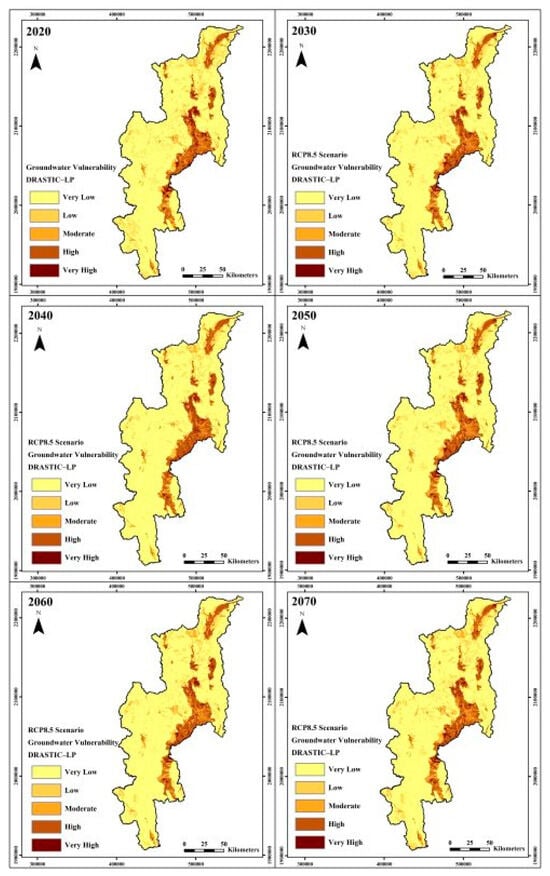 This paper aims to assess the future risks of groundwater resource vulnerability patterns, based on climate change, projected by the MIROC-ESM-CHEM model under the RCP8.5 scenario (indicating very high greenhouse gas emissions), stemming from anthropogenic activities and changes in land-use patterns (using the CA_Markov Chain model). These risks span various spatial and temporal scales. This study integrates climate change, land-use pattern changes models, and a groundwater vulnerability model using GIS-based overlay techniques to produce a groundwater vulnerability map for the next 50 years (2021–2070) in Chiang Mai Province, Northern Thailand. The new DRASTIC-LP approach, modified by Aller et al. [], effectively links groundwater resource vulnerability patterns with climate change and land-use pattern changes at the regional scale, with potential application in other areas of Thailand and even globally.