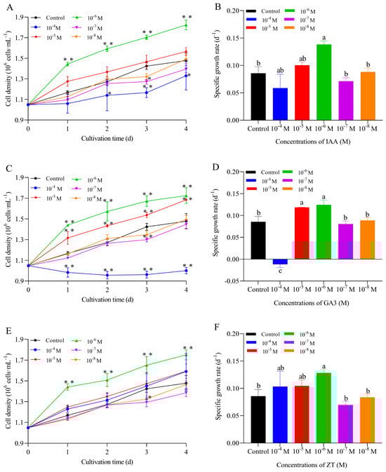 Effect of different concentrations of phytohormones IAA (A,B), GA3 (C,D), ZT (E,F) on the growth and specific growth rate of O. borgei. The differences between the control and experimental groups were statistically significant at p < 0.05 (*) and p < 0.01 (**), respectively. Different letters indicate significant differences among groups (p < 0.05 or p < 0.01).