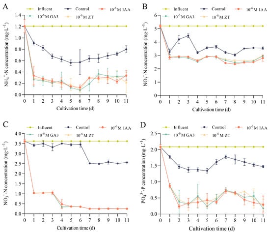 Assimilation curve of NH4+-N (A), NO2−-N (B), NO3−-N (C), and PO43−-P (D) of O. borgei treated by IAA, ZT, and GA3.