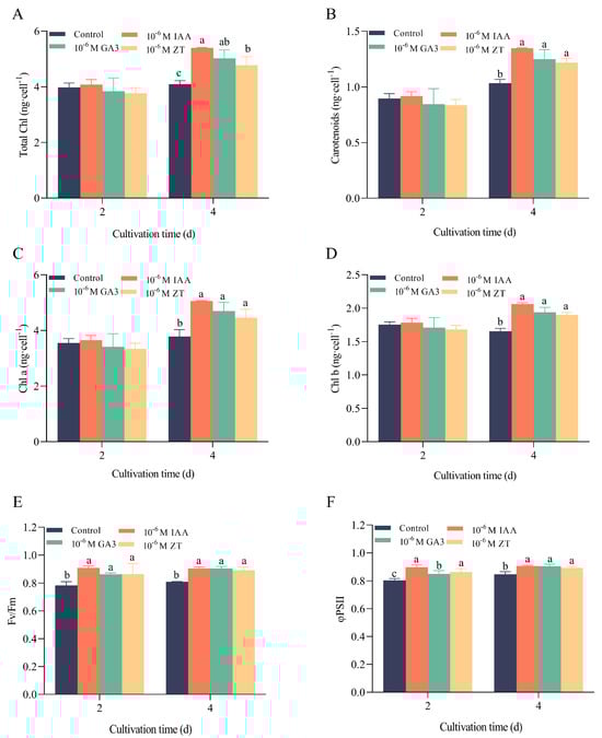Effect of phytohormones on photosynthetic pigment content (total Chl, (A); carotenoids, (B); Chl a, (C); Chl b, (D)) and photosynthetic activity (Fv/Fm, (E); φPSII (F)) of O. borgei. Different letters indicate significant differences among groups (p < 0.05 or p < 0.01).