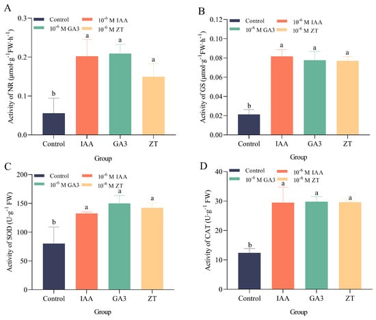 Effect of phytohormones on NR (A), GS (B), SOD (C), and CAT (D) activities of O. borgei. Different letters indicate significant differences among groups (p < 0.05 or p < 0.01).