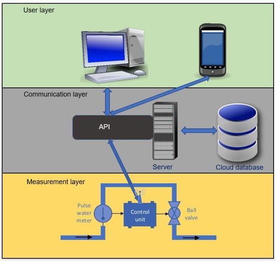 - The measurement layer consists of the pulse water meter, control unit, and ball valve. The pulse water meter gives information on the volume and consistency of water flow. Any pulse water meter may be used (irrespective of the number of pulses per litre). The central control unit (CPU) receives information regarding the water flow rate from the water meter, uses a wireless network for communication within the application interface, evaluates the water flow periodically using established rules in line with application logic, and controls the two-way valve. Any microcontroller can be used. The two-way ball valve controls the opening or closing of the water flow, which responds to requests from the control unit.