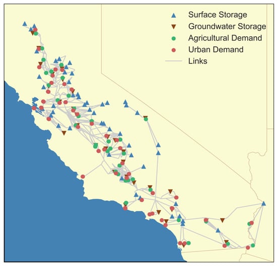 CALVIN’s limitations include its perfect hydrologic foresight (except for Arnold []); the linearization of nonlinear operations, such as hydropower; and simplified environmental regulations, water quality, and stream–aquifer interaction behavior. CALVIN currently provides a minimal representation of flood control and recreation operations []. Despite its limitations, CALVIN can simulate various water management scenarios and offer insights for statewide and regional water policy and planning decisions.