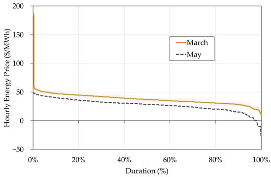 Price duration curves of hourly energy prices for months of March and May. Each month has a different hourly price variation pattern.