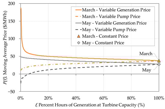 Moving average curves for months of March and May. The marginal variable energy price slope of the continuous and dashed price curves above decrease with increased hours of generation. Constant prices oversimplify plants that operate based on the marginal value.