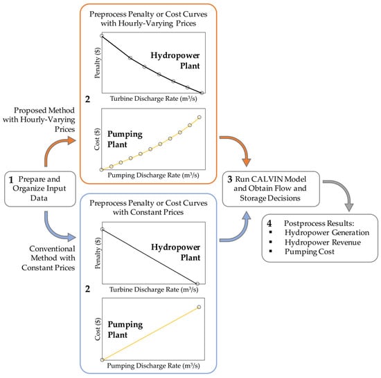 Figure 4 illustrates the run procedure of CALVIN with conventional constant average and proposed hourly varying energy prices. First, the input data are organized. These data include unit costs for moving water, economic demands for users (agricultural, urban, and hydropower), and hydrological time series, such as reservoir inflow, local inflow, and groundwater recharge. In the conventional model run, hydropower and pumping plant operating curves are modeled based on monthly constant average prices. CALVIN’s objective is to minimize total costs. Therefore, a hydropower penalty curve, which is the inverse of its benefit curve, represents the loss for not generating hydropower, depending on the turbine discharge rate. For a model run with the proposed method to incorporate hourly energy price variations, moving average energy prices are used to generate piecewise linear operating curves. Third, the CALVIN model is run with defined energy prices, and optimized flow and reservoir storage decisions are obtained. Finally, hydropower generation and revenue, as well as pumping costs, are postprocessed and compared, as presented in Section 3.
