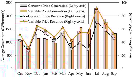 Figure 5 shows the monthly statewide modeled hydropower generation and revenue with constant and variable prices. Overall, the monthly generation and revenue patterns do not differ greatly. Generation and revenue have a similar monthly trend, higher in the summer. Hydropower revenue with variable prices (VPs) is greater than with constant prices (CPs) in all months. Hydropower generation is greater with variable prices in the spring (April–June) when average energy prices are the lowest, but the hourly price fluctuations are the highest. In these months, with price fluctuations, the differences between constant and variable price revenues are much greater. In other months, constant prices lead to higher hydropower generation but lower revenue (underestimating with constant prices). As the hourly price fluctuations decrease, the moving average of variable prices gradually approaches constant average prices. Months with identical power generation or revenue can be compared for analysis. For example, for March, the power generation in both price schemes is quite close (1.38 TWh and 1.39 TWh for constant and variable prices, respectively) but with a big difference in revenue. In March, with constant prices, the revenue is about USD 52 million, while the revenue with variable prices is USD 62 million. In October, January, and February, the revenue difference between variable and constant prices is fairly small, although generation with constant prices is higher. Using constant monthly average prices rather than hourly varying prices underestimates hydropower revenue.