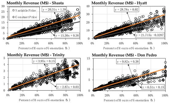 Figure 6 shows monthly revenue from the 82-year (October 1921 to September 2003) modeling period by the percent of hours of generation at turbine capacity for selected CALVIN hydropower facilities with integrated hydropower and water supply operations. The proposed hourly varying energy price scheme increases the revenue per capacity use, as indicated by the slopes of the linear regression lines. The divergent regression lines also imply that these hydropower plants are mostly operated for shorter durations in a given month. Hyatt is operated more at turbine capacity compared to other modeled plants. When water availability is greater, such as in wet months and years, plants are operated during most hours and generate more revenue.