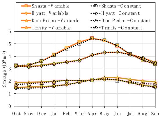 Modeled monthly average reservoir storage of selected facilities. Reservoir operations are little affected when variable energy prices are used.