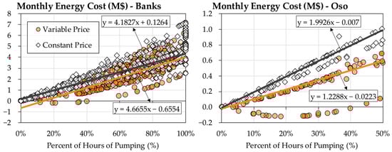 Figure 8 shows the monthly energy cost by percent of hours of operation for the Banks and Oso pumping plants. Overall, the energy costs are lower with hourly varying prices for both plants. But the Banks pumping plant is operated in most hours of a given month, so its regression line has greater slope with variable prices. As discussed earlier, when a plant operates during most hours, the constant average and hourly varying energy price schemes converge. Operations at the Oso pumping plant do not exceed 50% of hours in a given month. So, using constant average monthly prices greatly overestimates pumping energy costs.