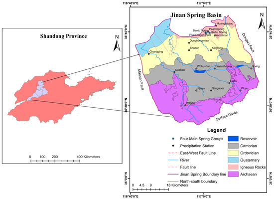 Jinan City is situated in the central and western regions of Shandong Province, China, with Mount Tai to the south and the Yellow River Plain to the north. As a result of this topography, the elevation gradually increases from the northern to the southern part of the basin, as shown in Figure 1. Its geographical position is around Latitude 36°39′59.99″ N and Longitude 116°58′59.99″ E. The Jinan Spring Basin is bounded by the surface divide of Mount Tai to the south, the Carboniferous–Permian igneous rocks to the north, and the Dongwu Fault and the Mashan Fault to the east and west, respectively (please see Figure 1). The Jinan Spring Basin has a warm, temperate continental climate, with an average annual rainfall of around 646.55 mm and a yearly temperature of about 14.2 °C. The distribution of precipitation across the area is uneven, with a general decrease in precipitation from the southeast to the northwest [13,30]. Jinan possesses numerous springs due to its distinctive hydrogeology, topography, and geological composition.