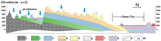 The Ordovician is characterised by the predominant presence of extensive deposits of thick limestone, argillaceous limestone, and dolomitic limestone. These rocks have well-developed karst fissures and high permeability, which are conducive for groundwater recharge, runoff, and discharge [13]. The karst network system has a south-to-north flow pattern, and the uniformity of the topography and presence of limestone enable atmospheric precipitation to replenish the karst water (Figure 2). The karst groundwater flow in the north of the Jinan Spring Basin is obstructed by impermeable Mesozoic igneous rocks or Carboniferous–Permian sand and shale. As a result, the groundwater gathers in the contact zone. Due to the elevated water pressure, the enclosed karst groundwater is discharged as upward springs in appropriate topographic and structural regions [33].