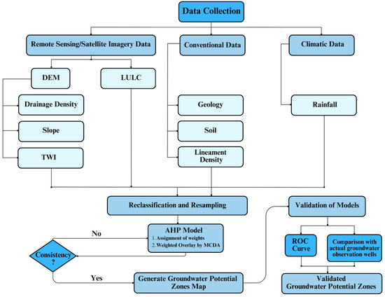 where α represents the area of the upslope, and β signifies the slope gradient. Groundwater potential zone mapping was validated using existing well data (i.e., groundwater level data). The process used to identify potential groundwater zones is elaborated in Figure 3 as a flowchart of the study.