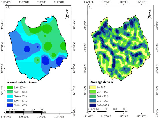 Rainfall’s direct impact on groundwater accumulation is due to the percolation and infiltration of rainwater into the subsurface, with longer duration and lower intensity rain causing greater infiltration. This is also in confirmation with research carried out by [24]. Additionally, rainfall significantly influences groundwater potential and serves as a crucial source of groundwater recharge [42]. In the Jinan Spring Basin, annual rainfall (2019) map preparation using the inverse distance weighted (IDW) method showed rainfall ranging from 516 to 749.2 mm (Figure 4A). The distribution of rainfall in the study area was classified into five rainfall zones: 674.3–749.2 mm (very high), 639.5–674.2 mm (high), 606.5–639.4 mm (moderate), 573.7–606.5 mm (low), and 516–573.6 mm (very low). Higher weights were placed on the higher rainfall subclasses, while the lower rainfall subclasses were assigned comparatively lower weights, as depicted in Table 3.