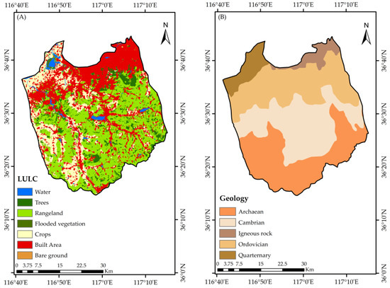 Land use/land cover (LULC) map (A) and geology map (B) of the study area.
