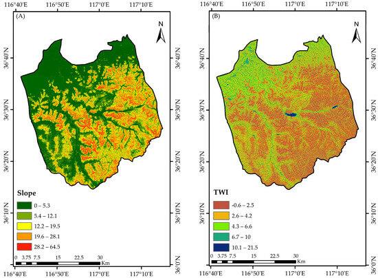Slope (A) and topographic wetness index (TWI) map (B) of the study area.