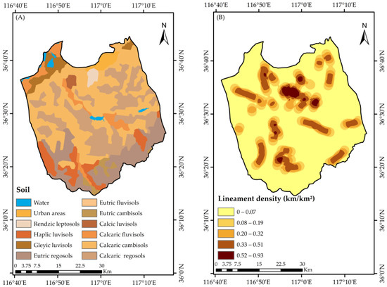 In the study area, diverse soil groups exhibit varying groundwater potential. The soil type significantly influences the groundwater recharge and runoff dynamics. The permeability and water-holding capacity of a soil type, which are influenced by its composition and texture, dictate its ability to facilitate infiltration and percolation [54]. The soil found in the study region falls under the following categories: Calcaric cambisols (38.69%), Eutric cambisols (1.74%), Calcaric fluvisols (5.48%), Eutric fluvisols (0.02%), Rendzic leptosols (1.02%), Gleyic luvisols (3.56%), Haplic luvisols (6.64%), Calcic luvisols (0.78%), Calcaric regosols (23.73%), and Eutric regosols (15.16%). These are shown in Figure 7A. Sandy soils (Eutric fluvisols) are well draining with low water retention, which aids in groundwater recharge, and they therefore received the highest weight. Loamy soils (Calcaric cambisols, Eutric cambisols, Calcaric fluvisols, Rendzic leptosols, Gleyic luvisols, Haplic luvisols, and Calcic luvisols) tend to permit higher infiltration due to their greater permeability, while clayey soils (Eutric regosols and Calcaric regosols) hinder infiltration due to lower permeability. The relationship between soil texture, conductivity, permeability, and moisture content dictates groundwater recharge; hence, the clayey soils in this study area received lower weights compared to sandy and loamy soils. In a previous study [36], the author noted that red loamy soils exhibit poor permeability, leading to the assignment of the lowest weight. On the other hand, red sandy soils and laterite soils possess moderate-to-very-high permeability, making them highly conducive to groundwater recharge owing to their increased porosity.