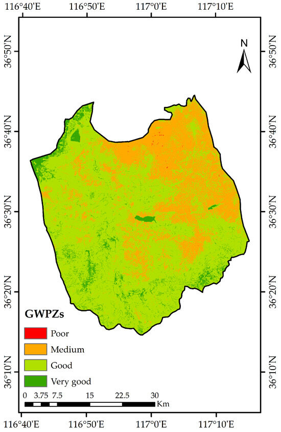 The main aim of this study was to delineate groundwater potential zones (GWPZs) within the Jinan Spring Basin, located in the midwestern Shandong Province of China. Due to the area’s landscape, the elevation reduces from south to north. Jinan has many springs because of its unique topographic features and geological structure. The Jinan karst aquifer system has a gentle monoclinic structure, with limestone serving as the main aquifer in the groundwater system. Limestone is easily dissolvable, forming a complex underground network system of dissolution fissures–cavities–pipes in Jinan. Karst groundwater flows mainly from south to north, which corresponds to the karst strata’s dipping and the topography. The basin has seen persistent difficulties and issues in developing groundwater due to the complex and diverse characteristics of the terrain.