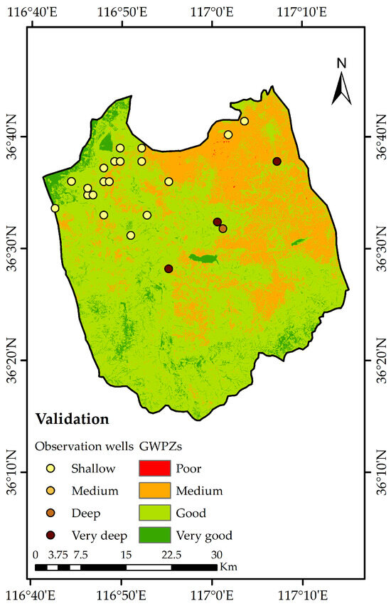 To assess the accuracy of the generated groundwater potential map, it was subjected to cross-validation against groundwater level data, as depicted in Figure 9. This validation process involved analysing a total of 23 groundwater wells distributed across the study area, encompassing diverse geological characteristics, land use/land cover types, and variations in topography. These groundwater wells were classified into four categories based on the measured depth to the water table: shallow (<56.47 m), medium (56.48–85.15 m), deep (85.16–113.83 m), and very deep (>113.83 m). A deeper depth to water table category is indicative of poor groundwater potential.